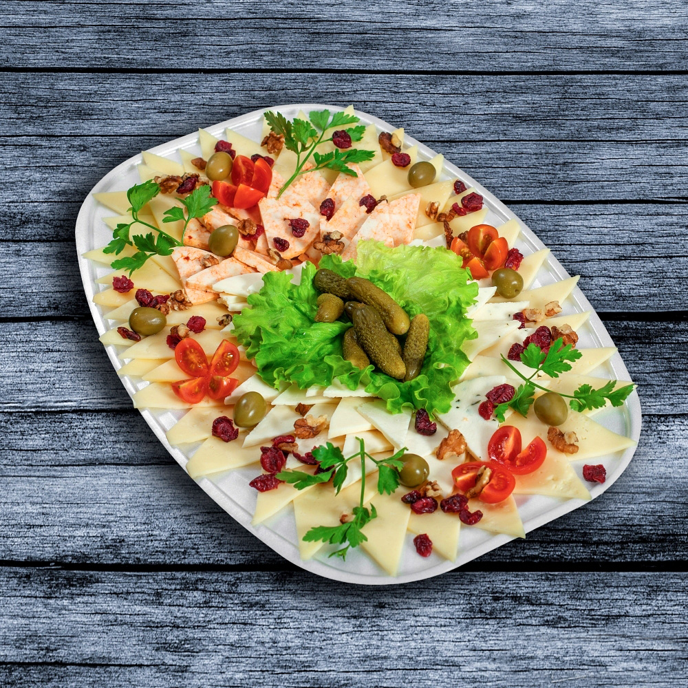 SA PAPRIKOM, MASLINE, KISELI KRASTAVCI, MINI RAJČICE, ORASI, BRUSNICE, PERŠIN I ZELENA SALATA.