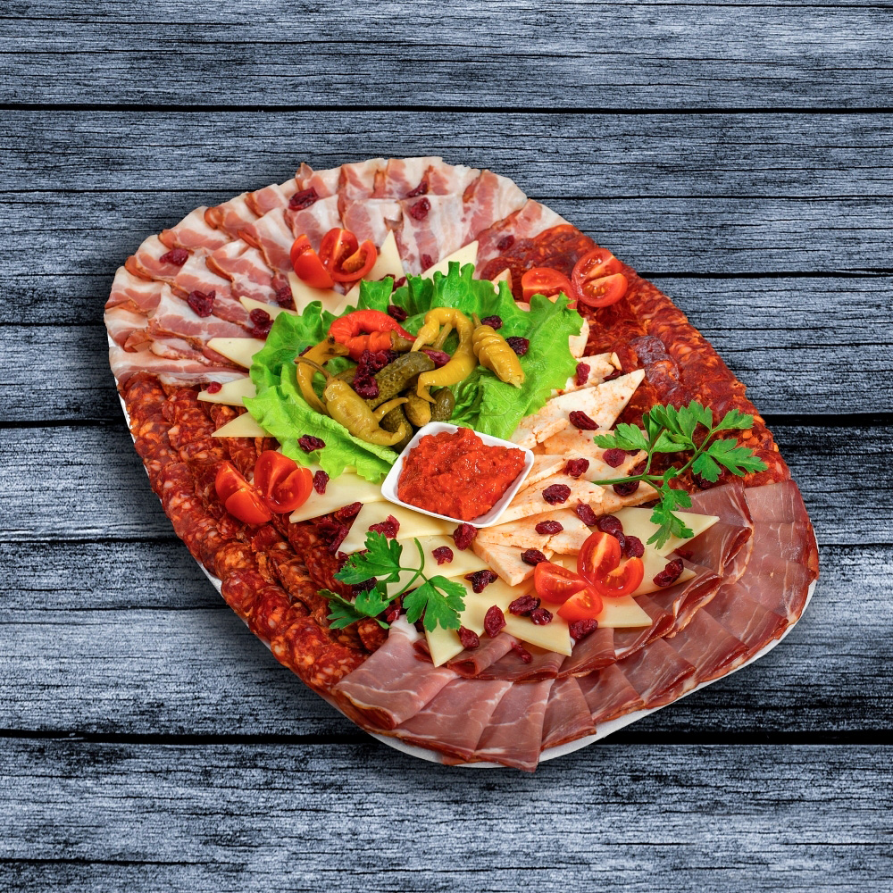 SASTAV: SLANINA, SLAVONSKA KOBASICA, KULENOVA SEKA, SUHA SLAVONSKA ŠUNKA, DIMLJENI SIR SA PAPRIKOM, TVRDI KRAVLJI SIR,