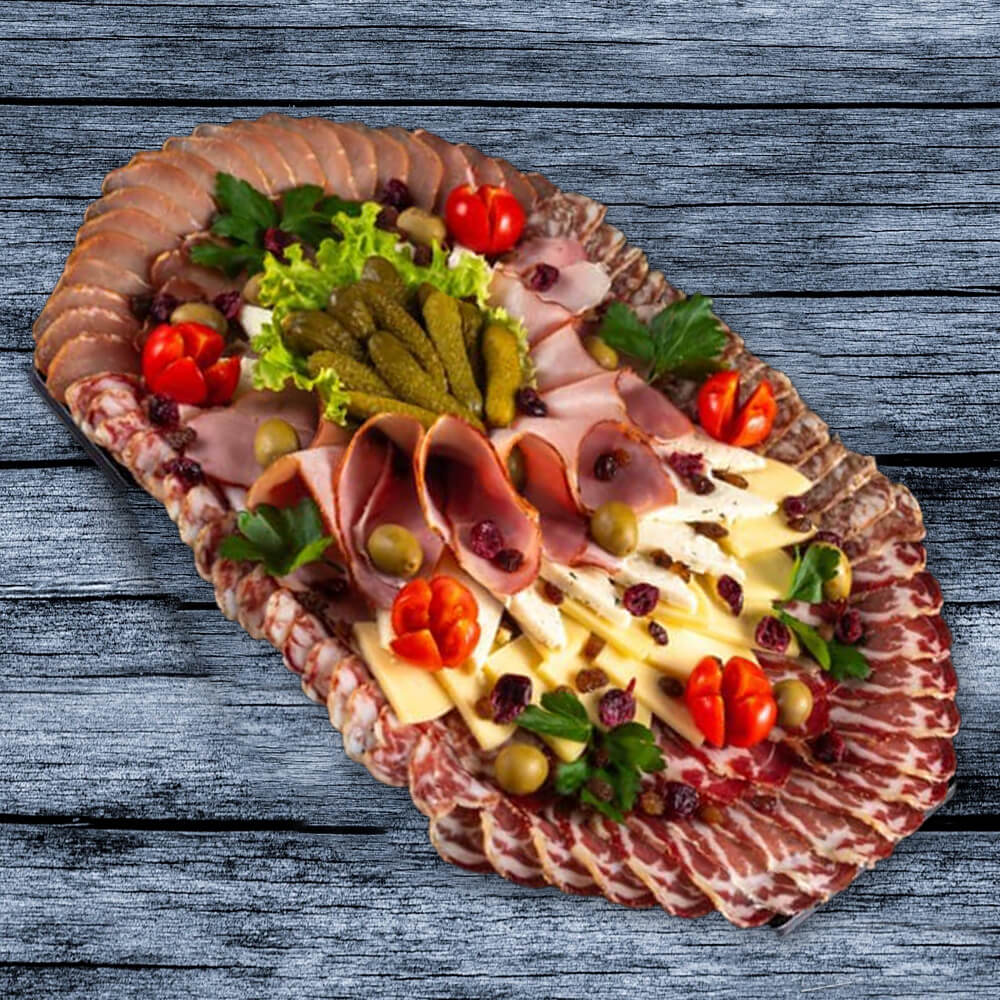 SASTAV: DOMAĆA SALAMA, KUHANA ŠUNKA, PEČENICA, DOMAĆA KOBASICA, BUĐOLA, DILJENI KRAVLJI SIR, SIR SA ZAČINIMA, MLADI KRAVLJI SIR, MINI RAJČICE, PERŠIN, ZELENA SALATA, BRUSNICE, GROŽĐICE, MASLINE, KISLEI KRASTAVAC